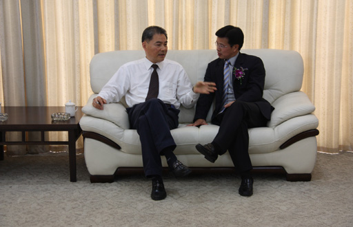 浙江大學(xué)黨委書(shū)記金德水(左一)與浙商創(chuàng)投管理公司董事長(zhǎng)陳越孟(右一)在休息室交談
