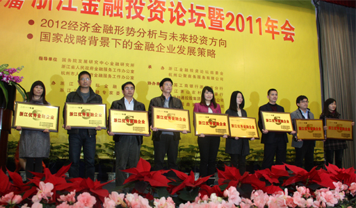 論壇還舉行了頒獎儀式,表彰在浙江金融界貢獻(xiàn)突出的 “首屆(2011)浙江金融十大領(lǐng)軍人物”和“浙江優(yōu)秀金融企業(yè)”。浙商創(chuàng)投榮獲“浙江優(yōu)秀金融企業(yè)”。