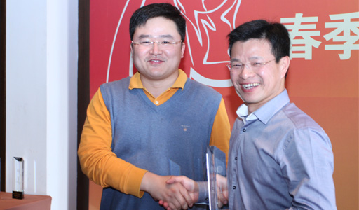 北京金房房地產(chǎn)公司董事長金飛鴻(左)為浙商創(chuàng)投成都分公司總經(jīng)理 馮峻(右)頒得“凈桿季軍 ”