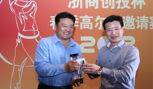 浙商創(chuàng)投董事長陳越孟(右)為北京金房房地產(chǎn)公司董事長金飛鴻(左)頒得“總桿冠軍”
