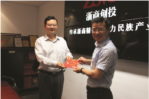 金承濤(上圖左)代表西湖區(qū)為浙商創(chuàng)投送上2012年度財政貢獻(xiàn)獎勵