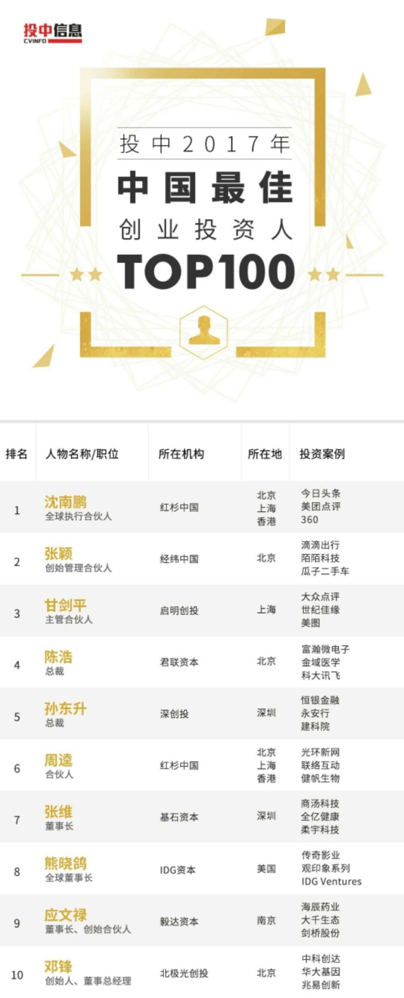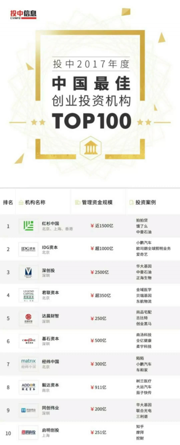 浙商創(chuàng)投入選“2017中國最佳創(chuàng)業(yè)投資機(jī)構(gòu)TOP100”榜單。