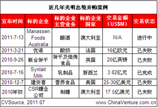 ChinaVenture投中集團旗下數據庫產品CVSource統計顯示:2010年初至今,光明食品已第6次傳出跨境并購的消息,除7月13日欲收購澳大利亞乳制品企業Manassen Foods的交易正在進行中,其它5起案例中的4起均以失敗告終,僅去年3.82億美元收購新西蘭奶粉生產商Synlait Milk 51%股權的交易成功(見表1)。