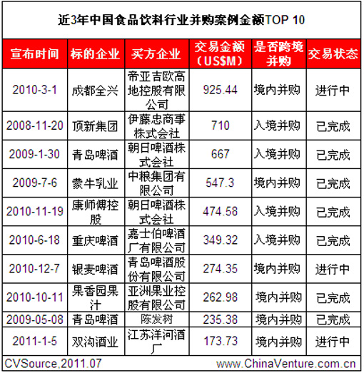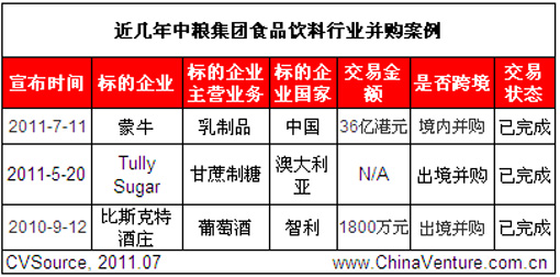最近一年,食品飲料行業的另一大買家是中糧集團。2010年9月和2011年5月,中糧先后收購智利比斯克酒莊和澳大利亞蔗糖企業Tully Sugar。7月11日,中糧斥資近36億港元,購入蒙牛乳業公司股份,其持股比例隨之上升至28.04%,進一步穩固其單一最大股東地位。(見表3)。