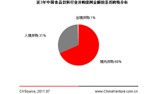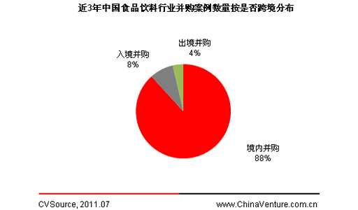 根據ChinaVenture投中集團旗下數據產品CVSource統計顯示,2008年7月至今,中國食品飲料行業并購案例共221起,其中境內并購195起,占比88%;入境并購18起,占比8%;出境并購8起,占比4%(見圖1)。
