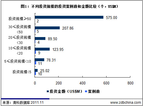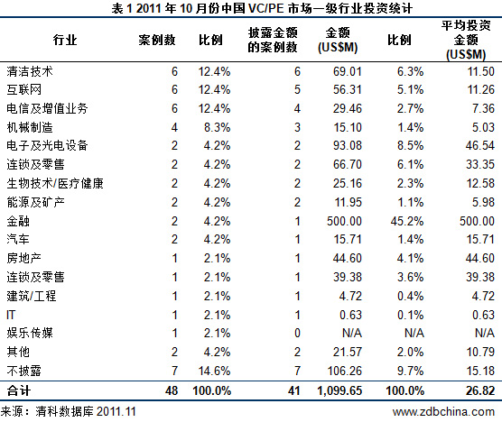 受中概股海外市場上市受挫和國慶長假影響,10月VC/PE投資未上市企業和參與定向增發的腳步均有所放緩。根據清科數據庫統計,2011年10月中國創業投資暨私募股權投資市場共發生投資案例48起,其中披露金額的41起投資案例涉及金額約11.00億美元,平均每起案例涉資約2682萬美元。從行業方面來看,10月份投資案例主要分布在清潔技術、互聯網和電信及增值業務等15個一級行業。從案例的個數上看,清潔技術行業今年首次拔得頭籌,與互聯網和電信及增值業務行業并列第一,各有6起投資案例發生,分別占投資案例總數的12.4%;機械制造行業位居第二位,有4起投資案例發生,占比8.3%。