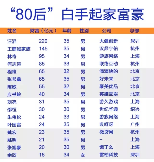 56位“80后”企業(yè)家登上今年胡潤百富榜。其中有16位是白手起家的,是去年的2倍,基本都從事IT行業(yè)。值得注意的是,在近幾年大熱的互聯(lián)網(wǎng)金融領域,總部設在杭州的微貸網(wǎng)CEO姚宏成為該行業(yè)榜上新貴,擁有財富23億元的他成為“80后”白手起家富豪代表之一,也是今年榜單上唯一一個專做P2P行業(yè)的富豪。